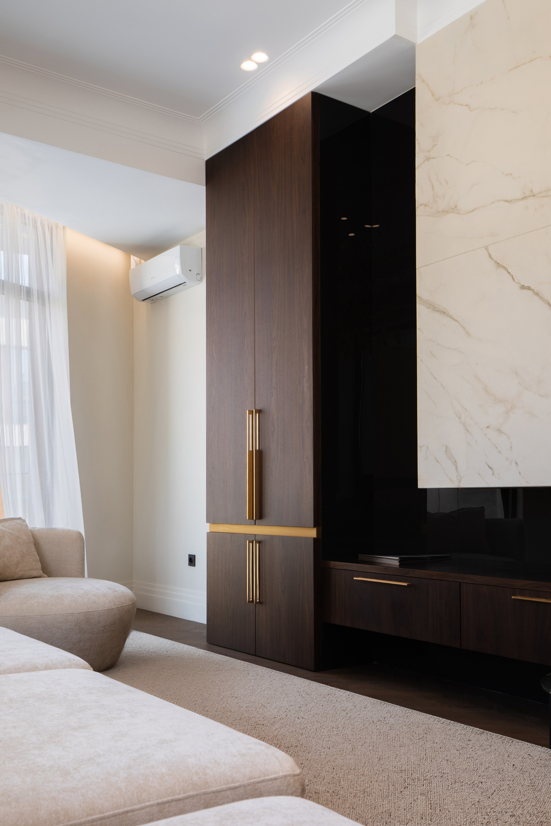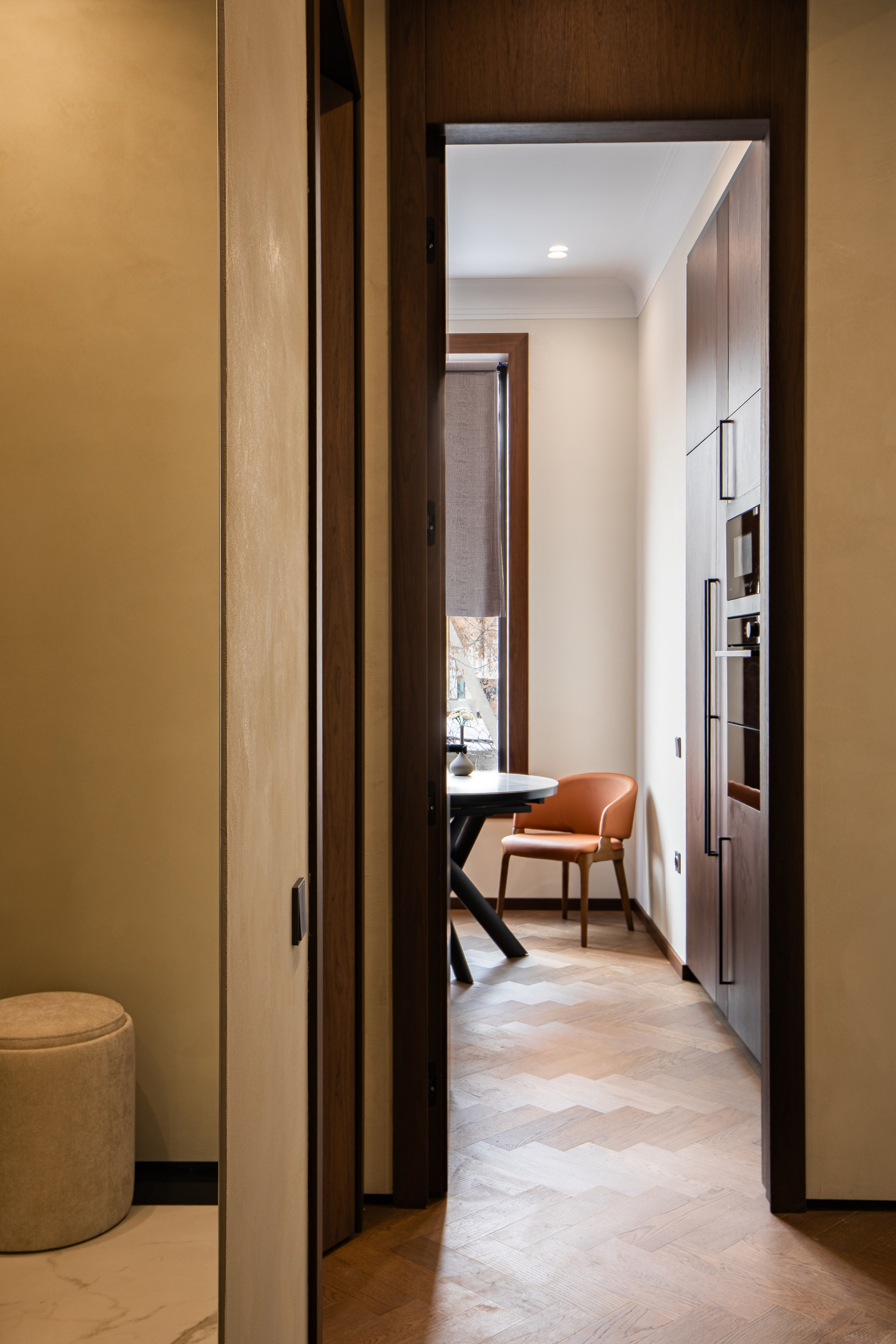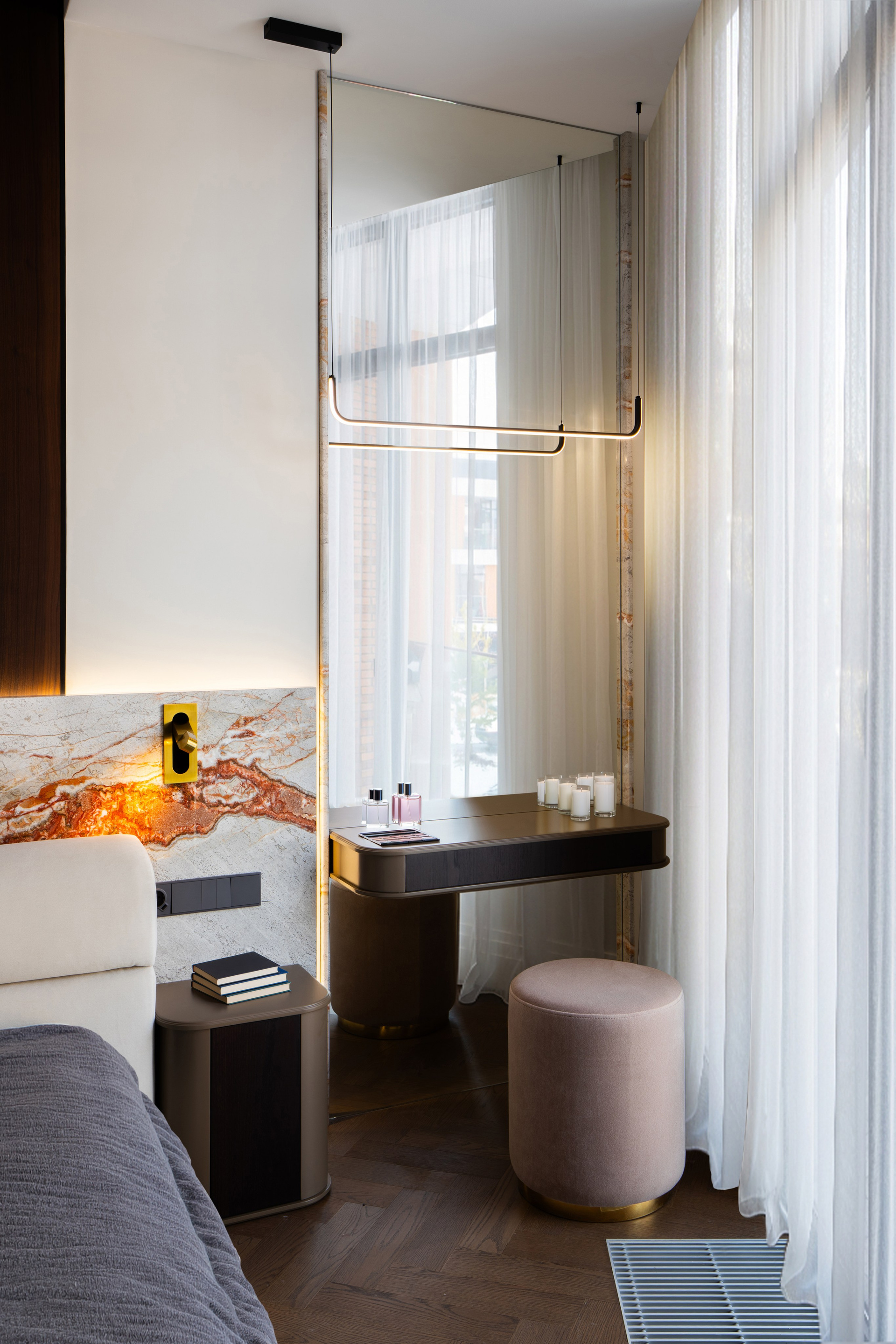 Съёмка деталей интерьера и дизайнерских решений крупным и общим планом. Естественное освещение апартаментов.