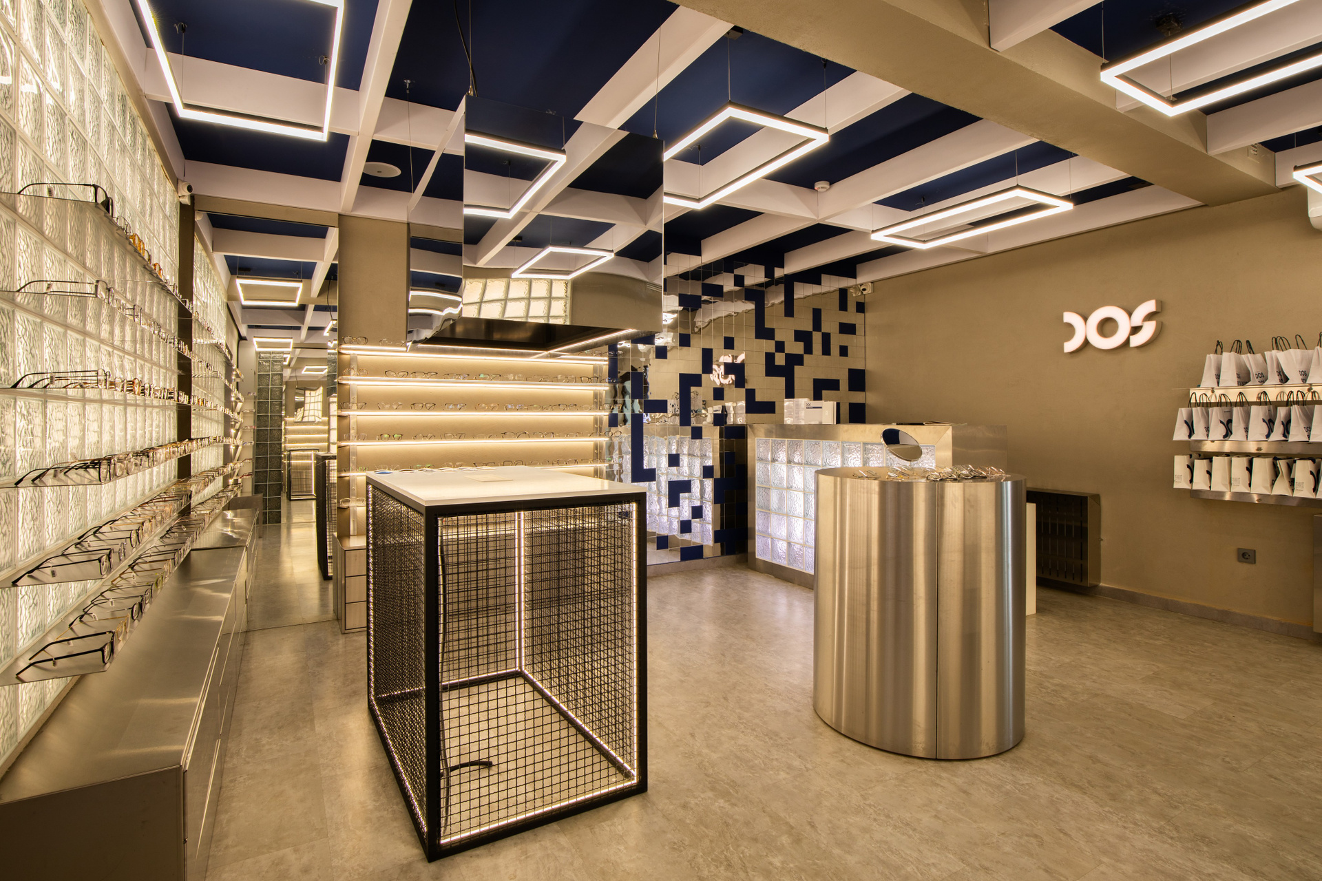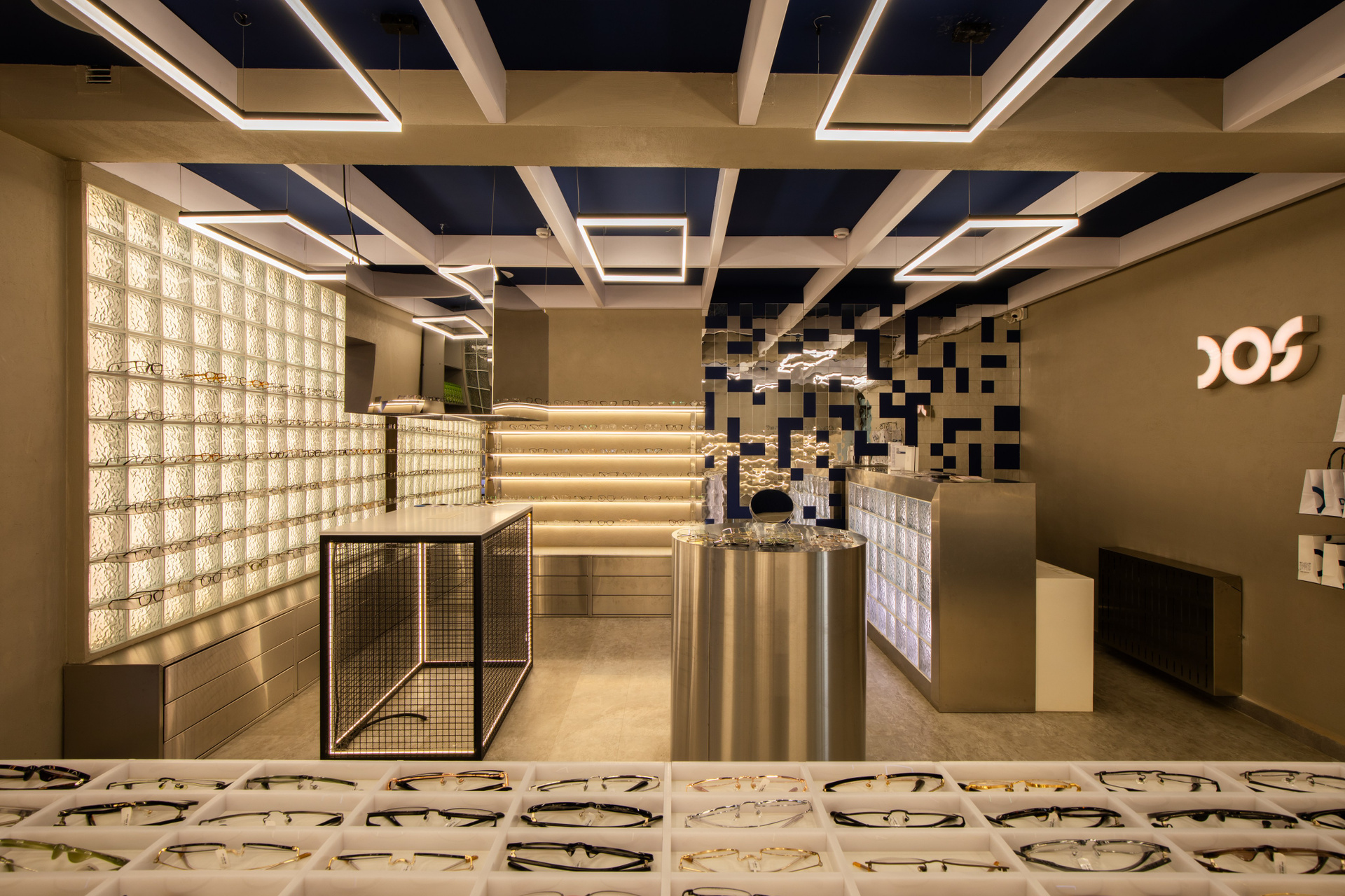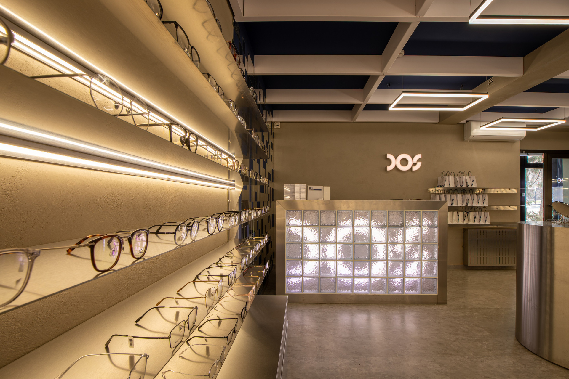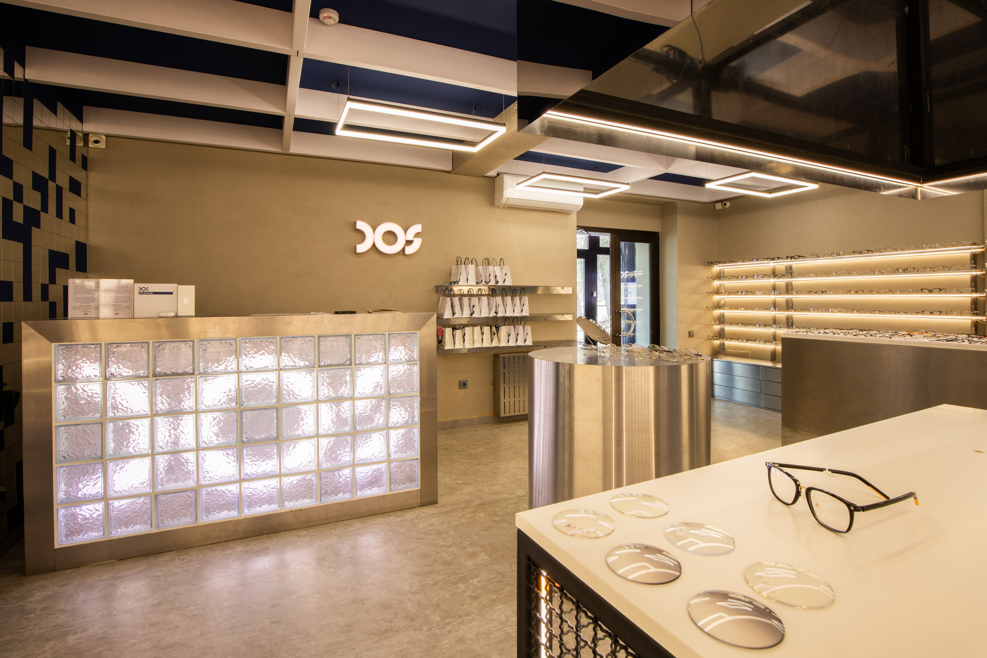 Интерьерная съёмка бутика и салона оптики «DOS». Ровные линии, детали интерьера и дизайнерские решения крупным и полным кадром.
