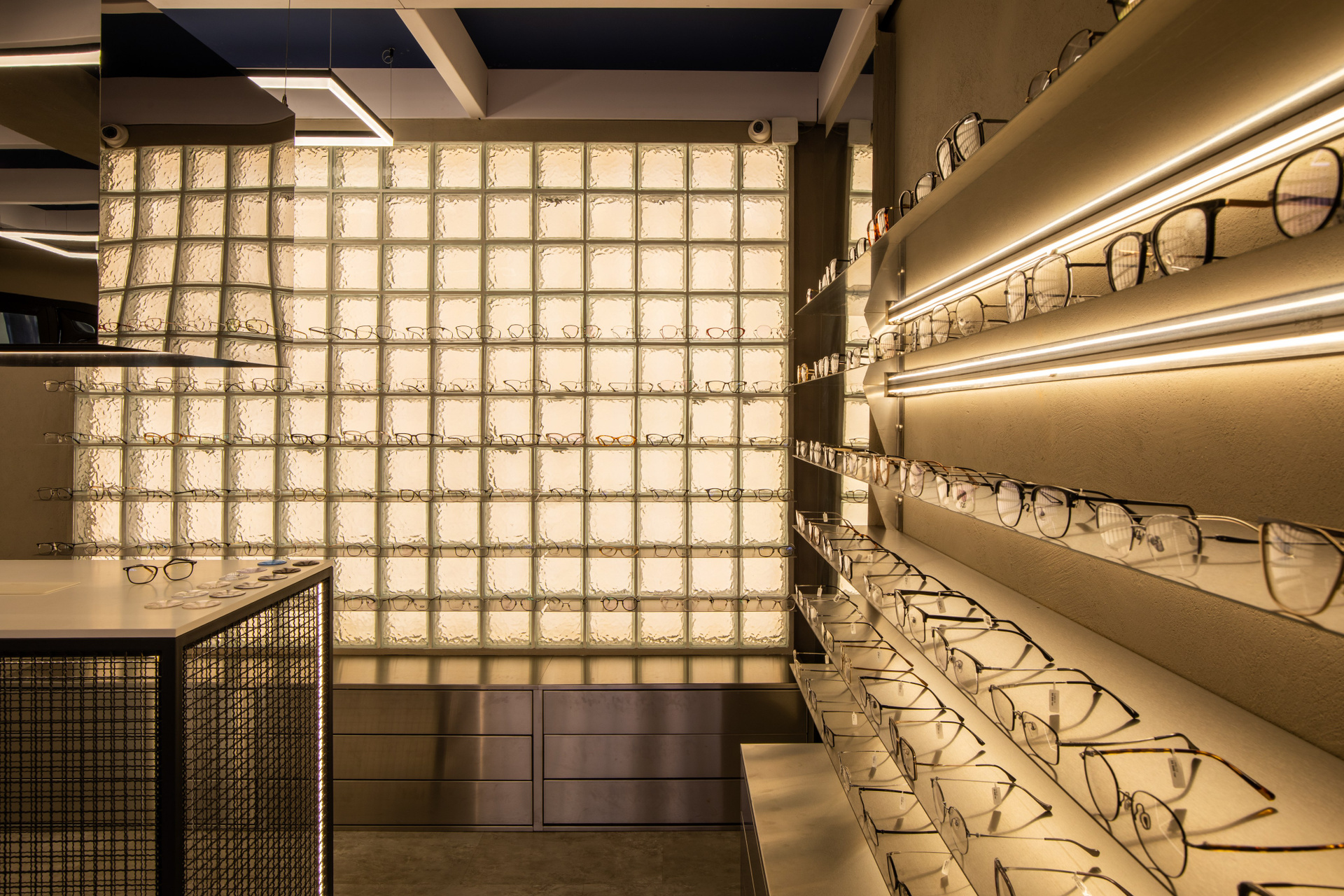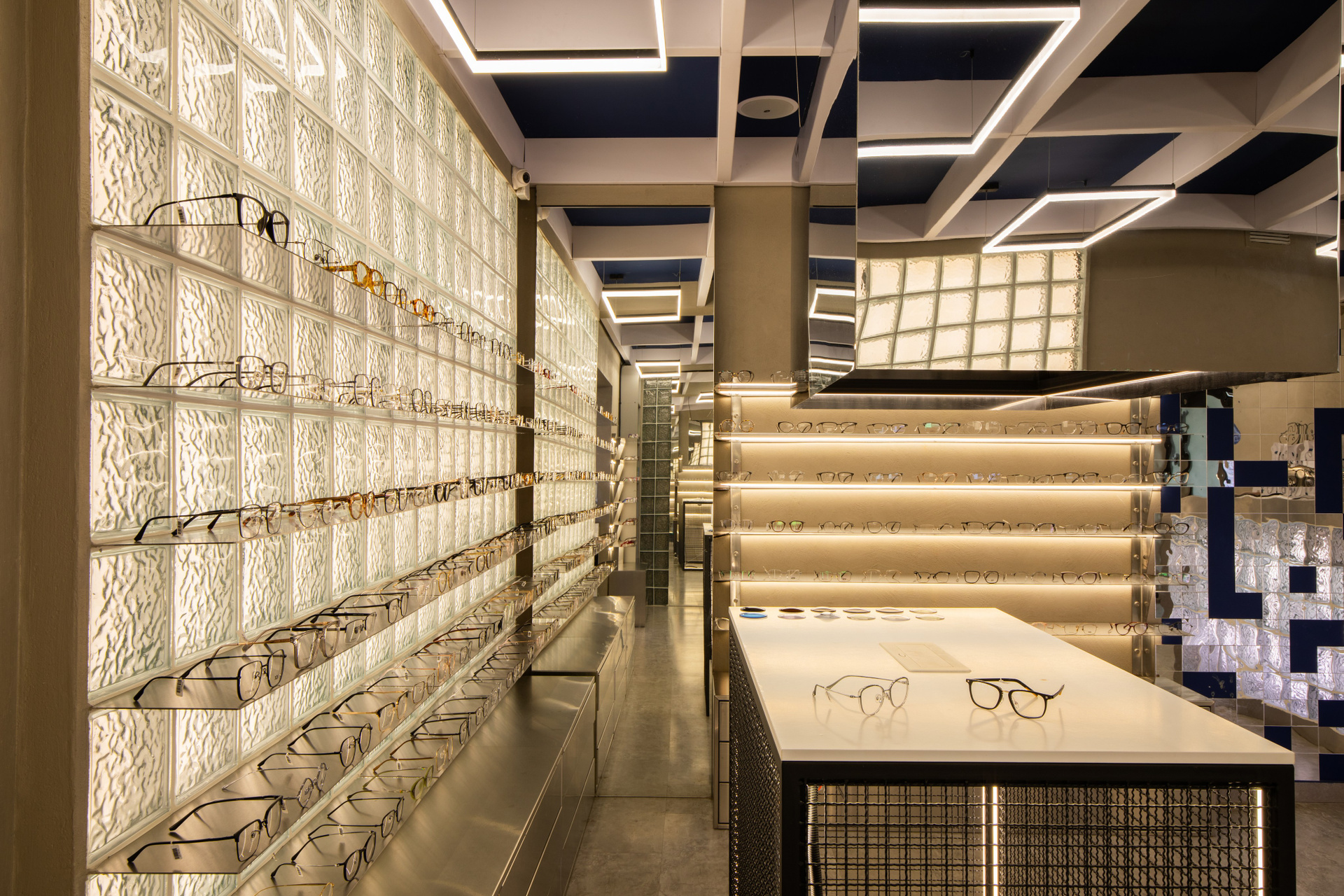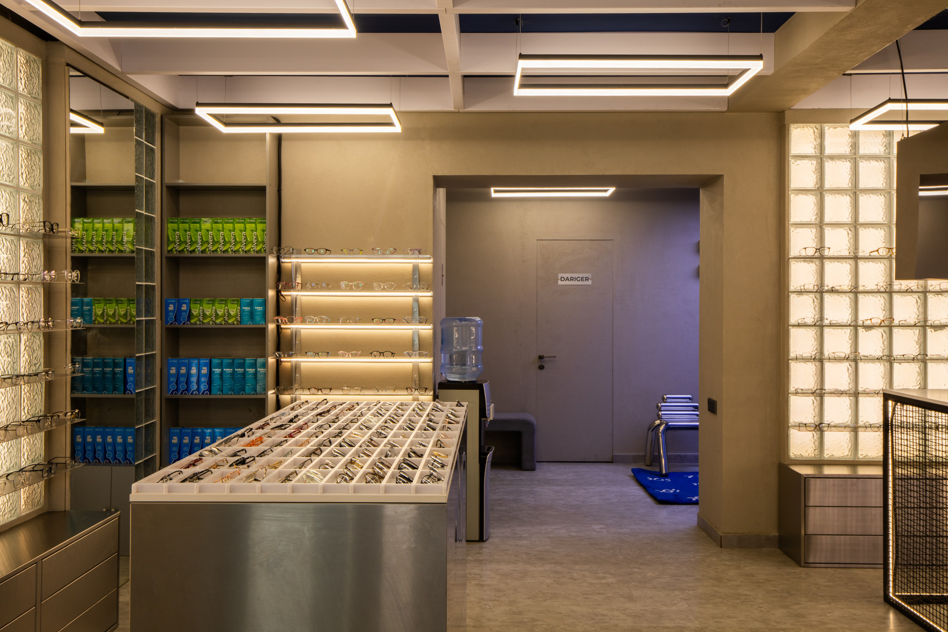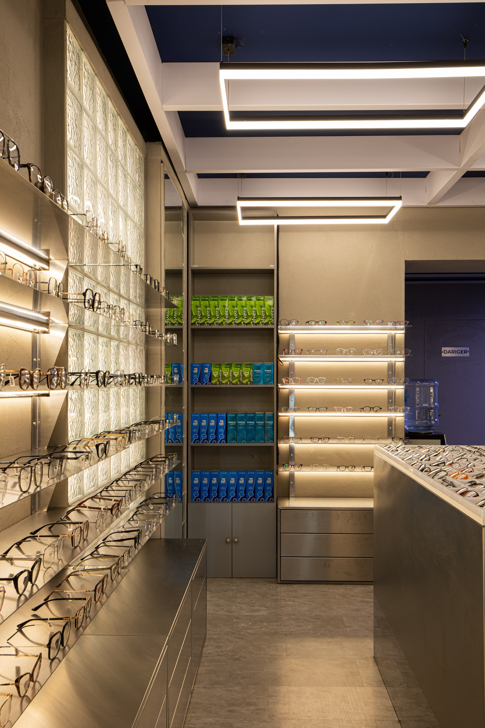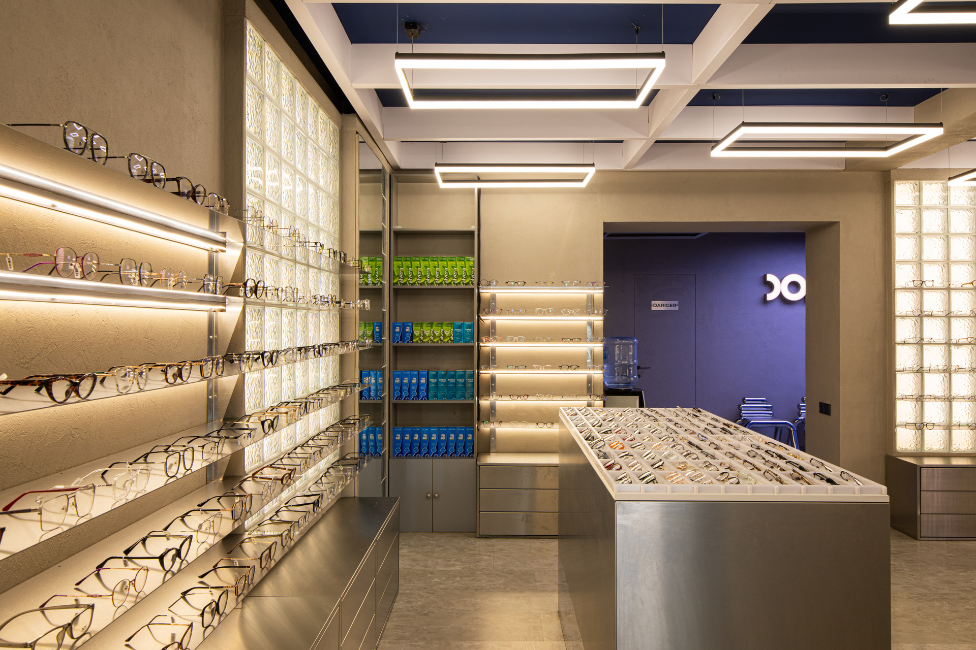 Интерьерная съёмка бутика и салона оптики «DOS». Ровные линии, детали интерьера и дизайнерские решения крупным и полным кадром.