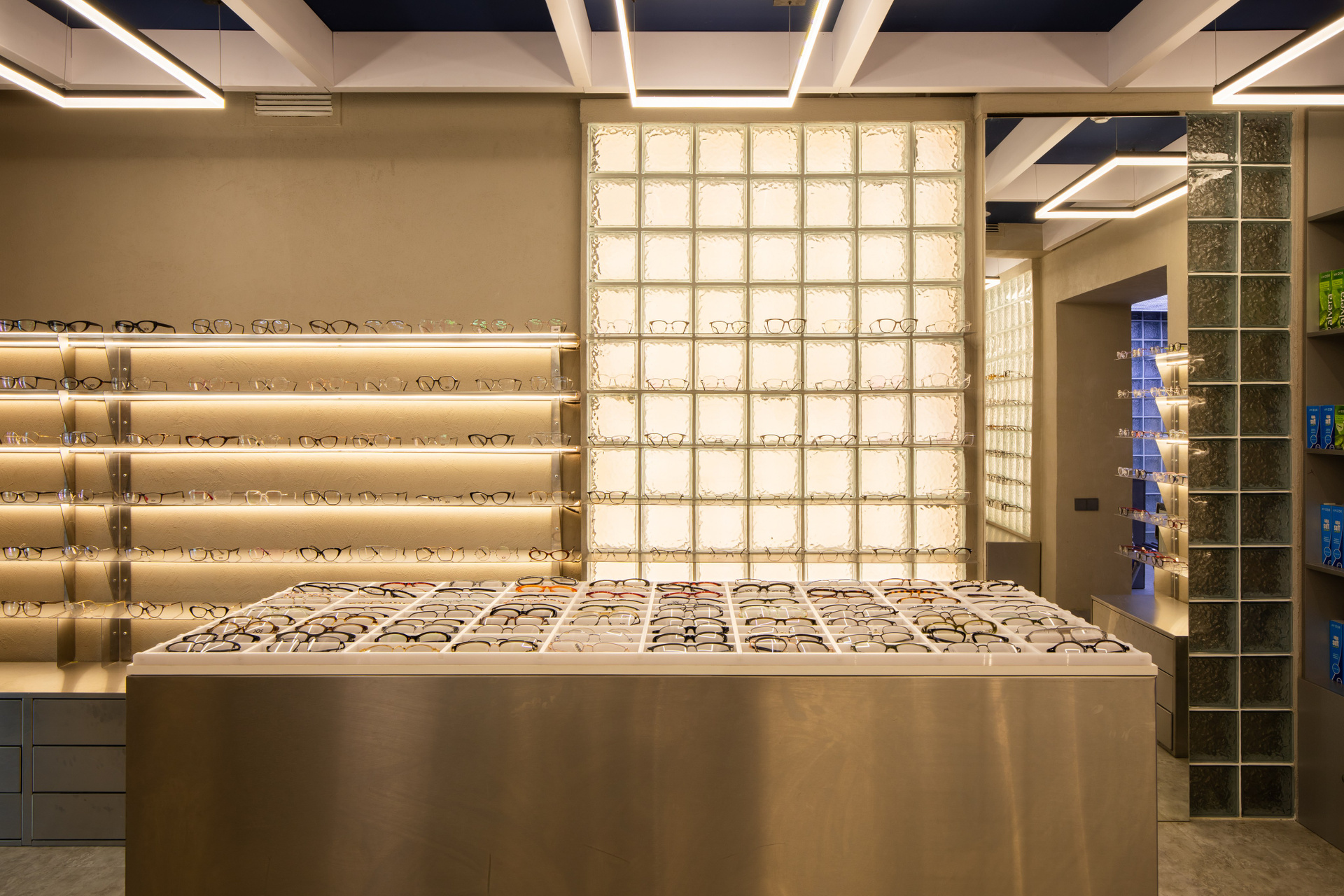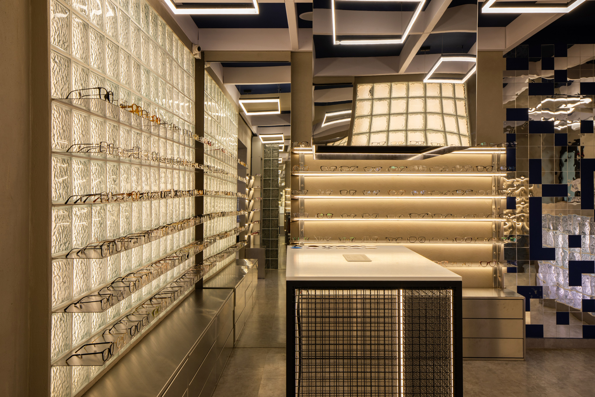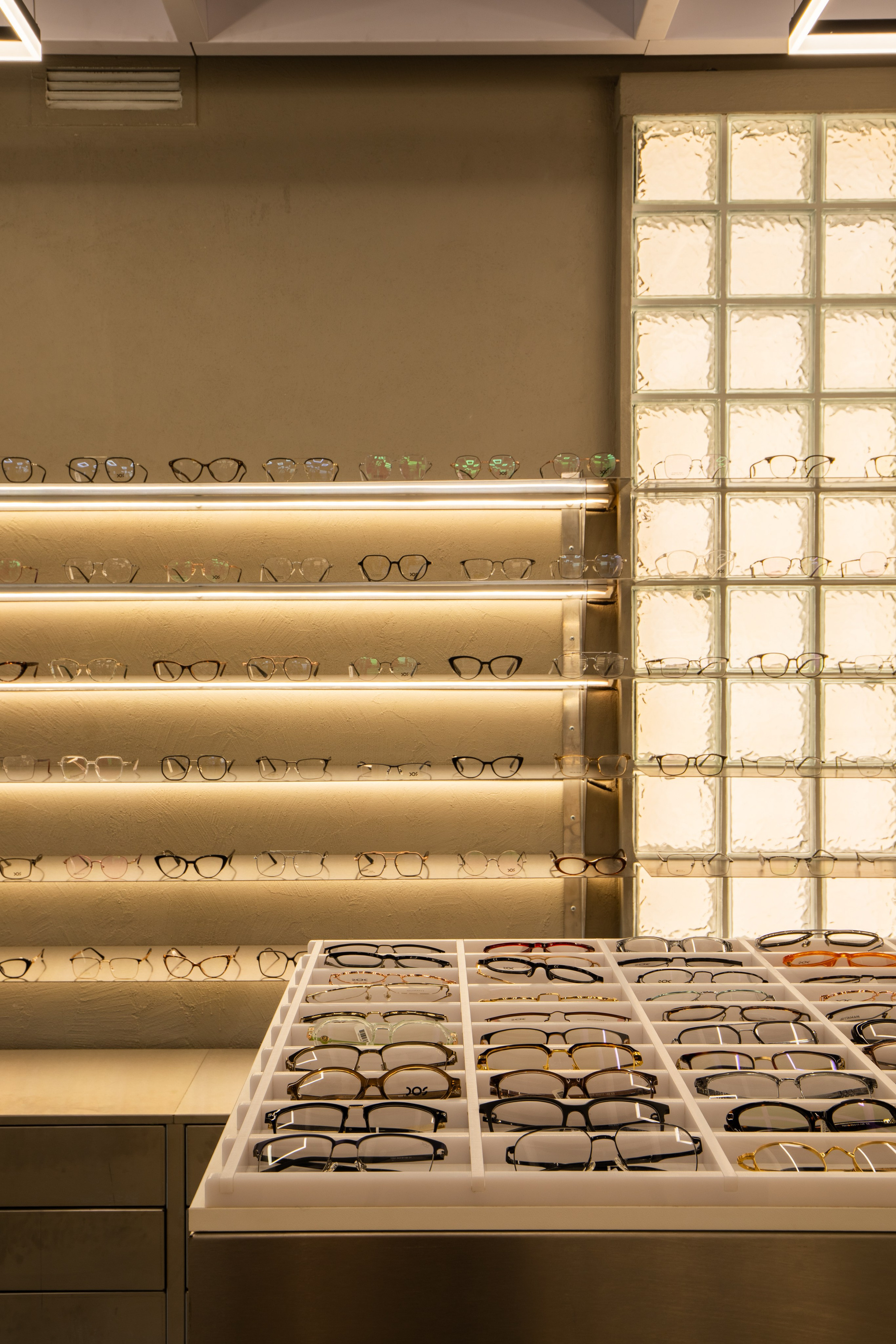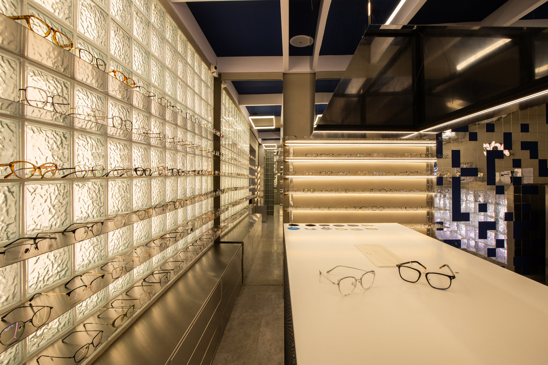 Интерьерная съёмка бутика и салона оптики «DOS». Ровные линии, детали интерьера и дизайнерские решения крупным и полным кадром.